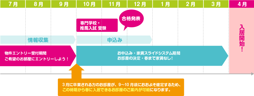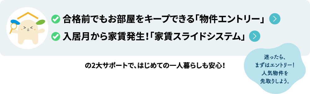 早い時期(7月~9月)から住みたいお部屋を選ぶことが出来るのが物件エントリー!