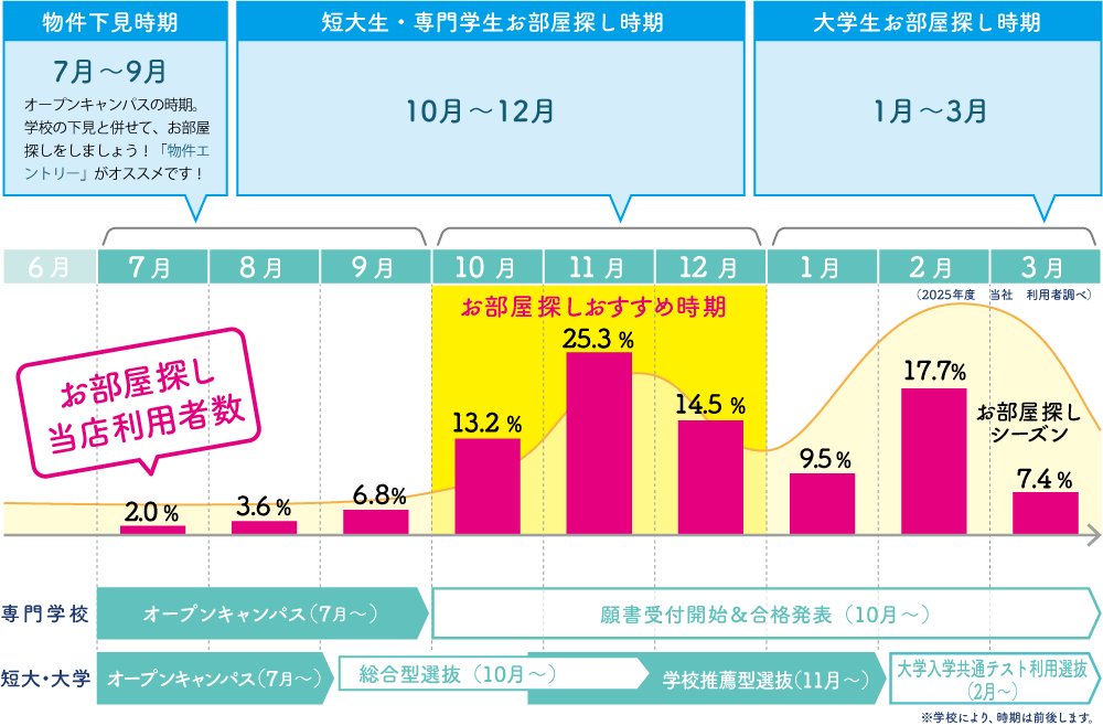 合格発表時期の1月~3月にお部屋探しが集中します。
