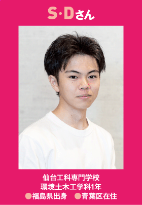 - 今日はよろしくお願いします。仙台でのひとり暮らしのこと、いろいろ聞かせてください。まず、お住まいのエリアと通学方法、通学時間を教えてください。